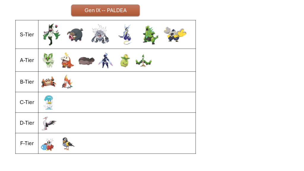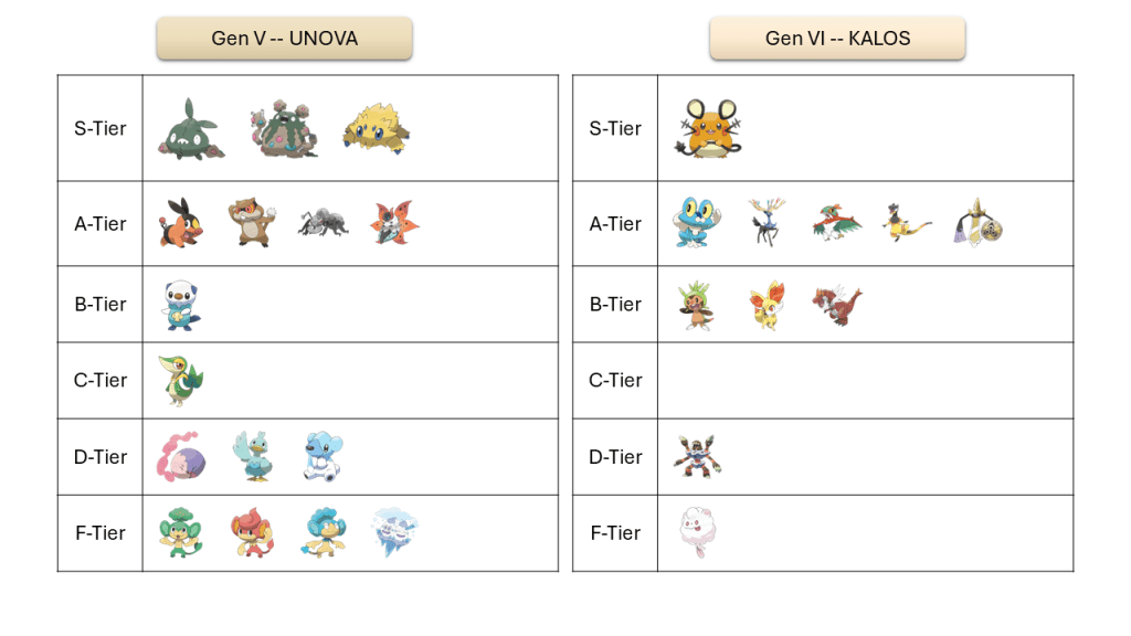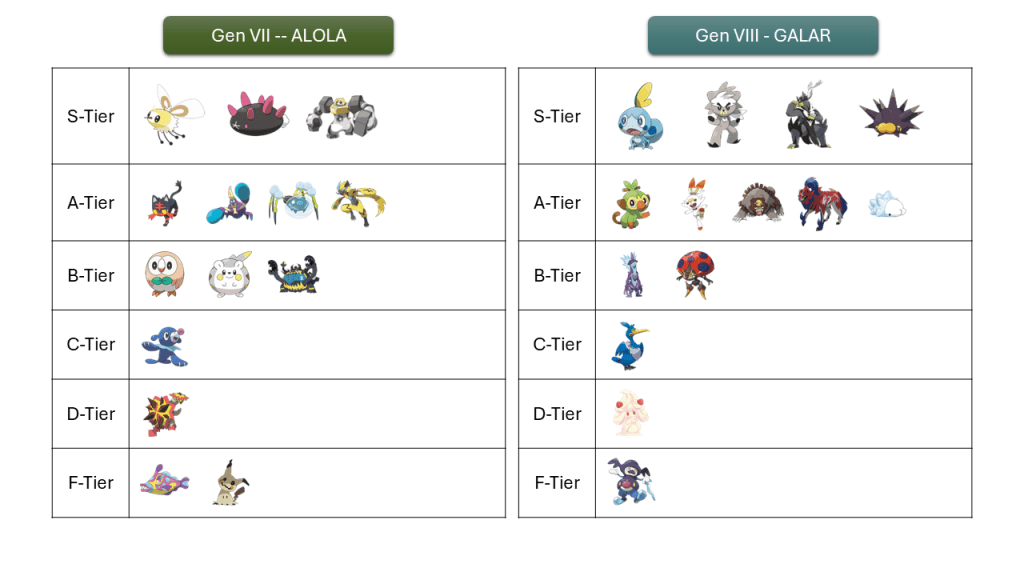 I know you are probably curious who are my starters. So I’ve prepared a thoroughly researched analysis of each generation rating the S-Tier ‘mon down to the F-Tier ‘mon. Again it could be because they are cute, they dance, they are a bug. Or because they make an unfortunate sound, or are leaking bodily functions, or are annoying.
