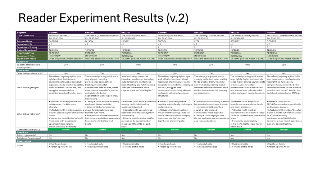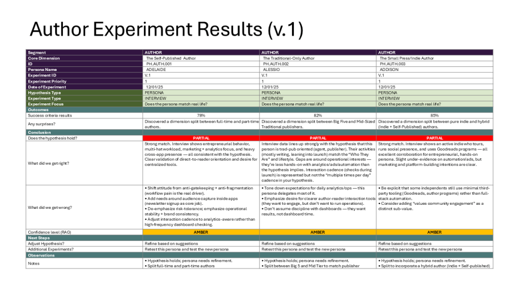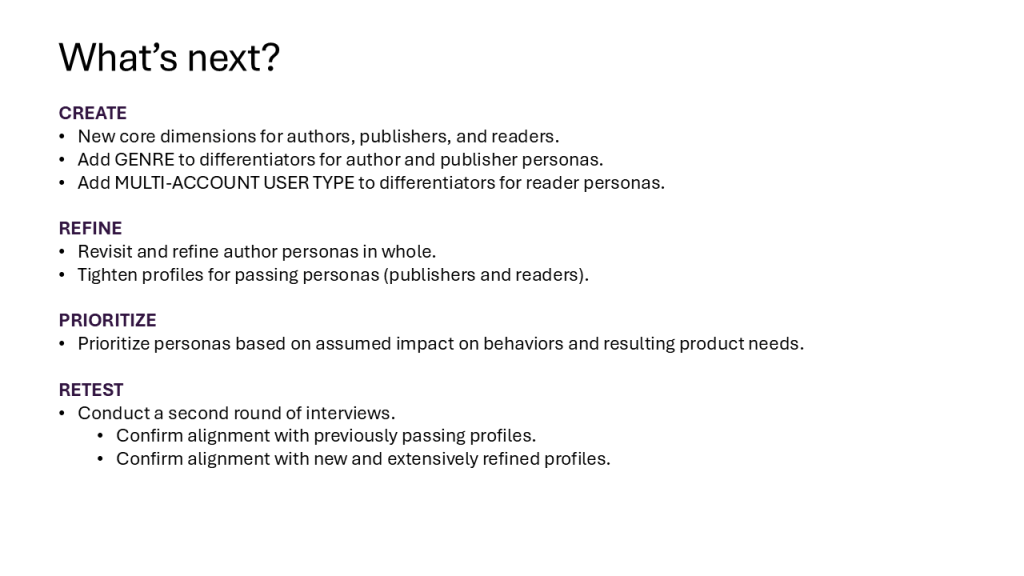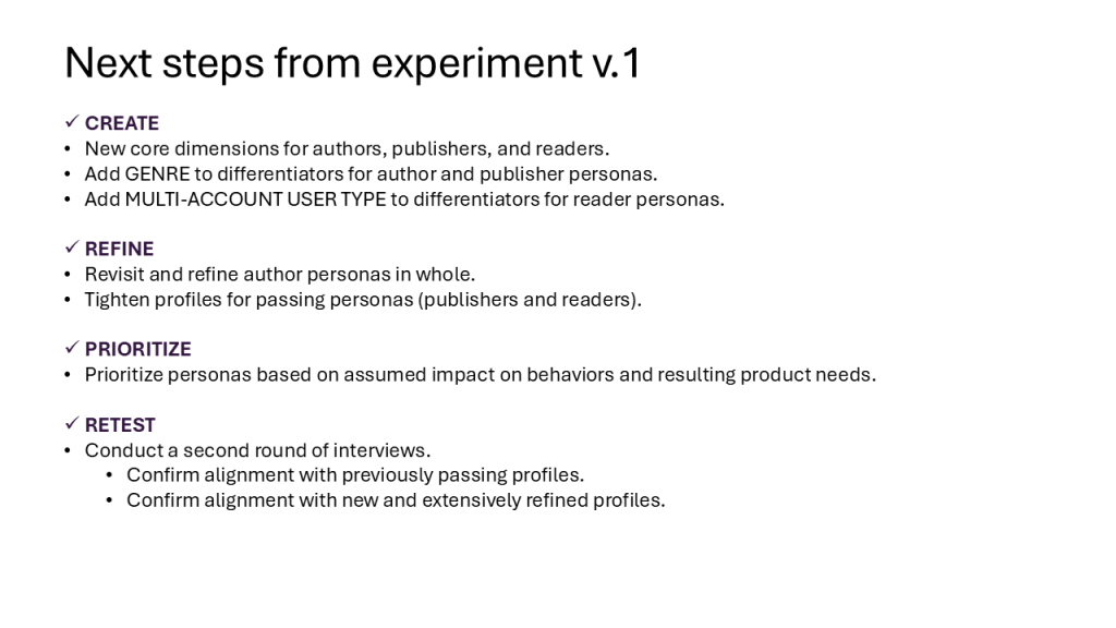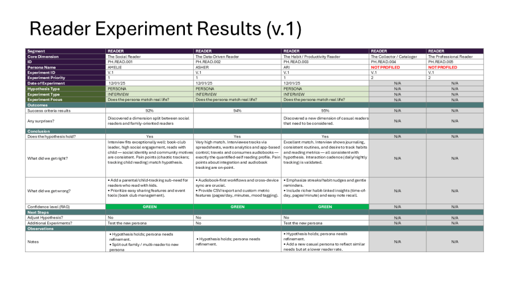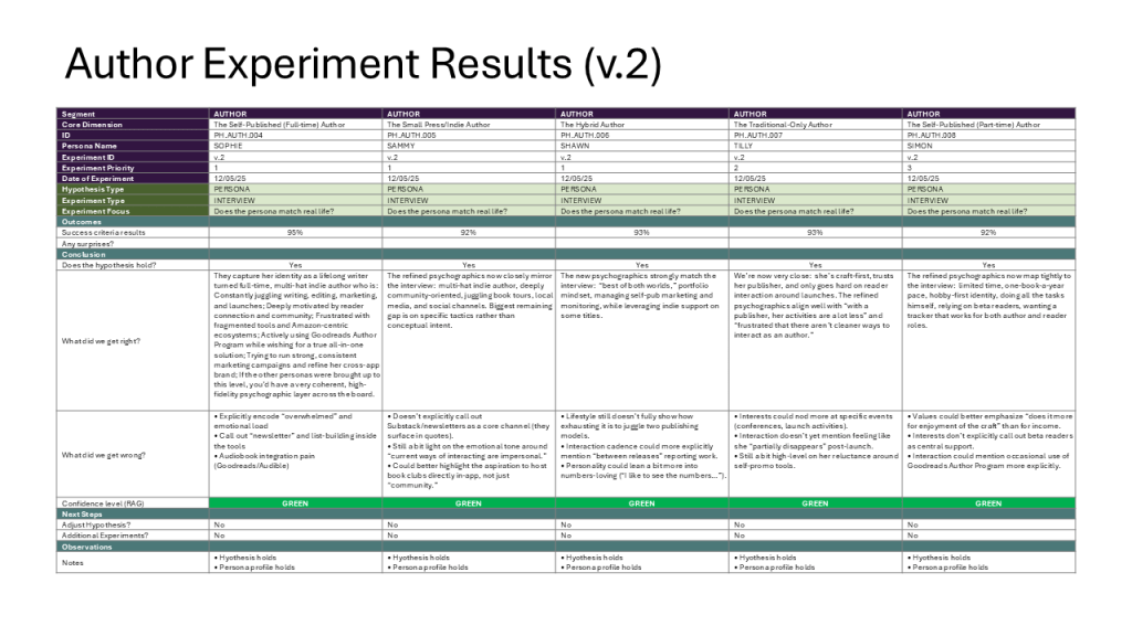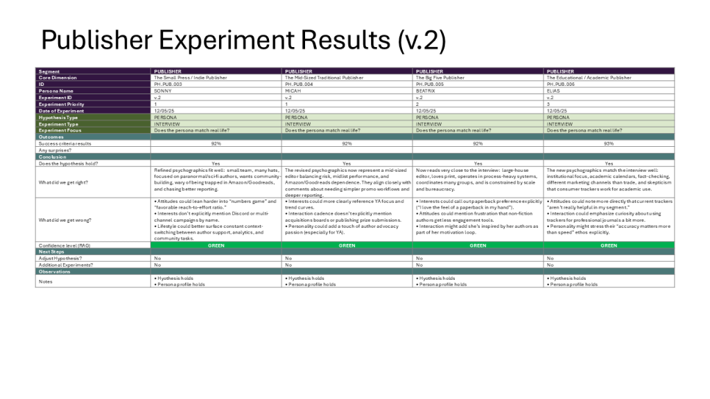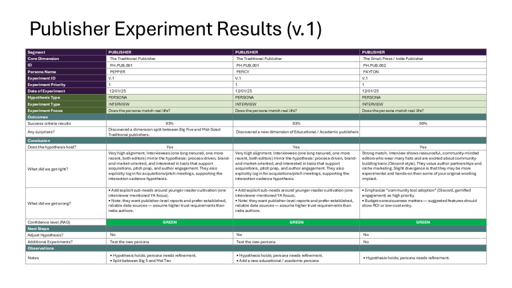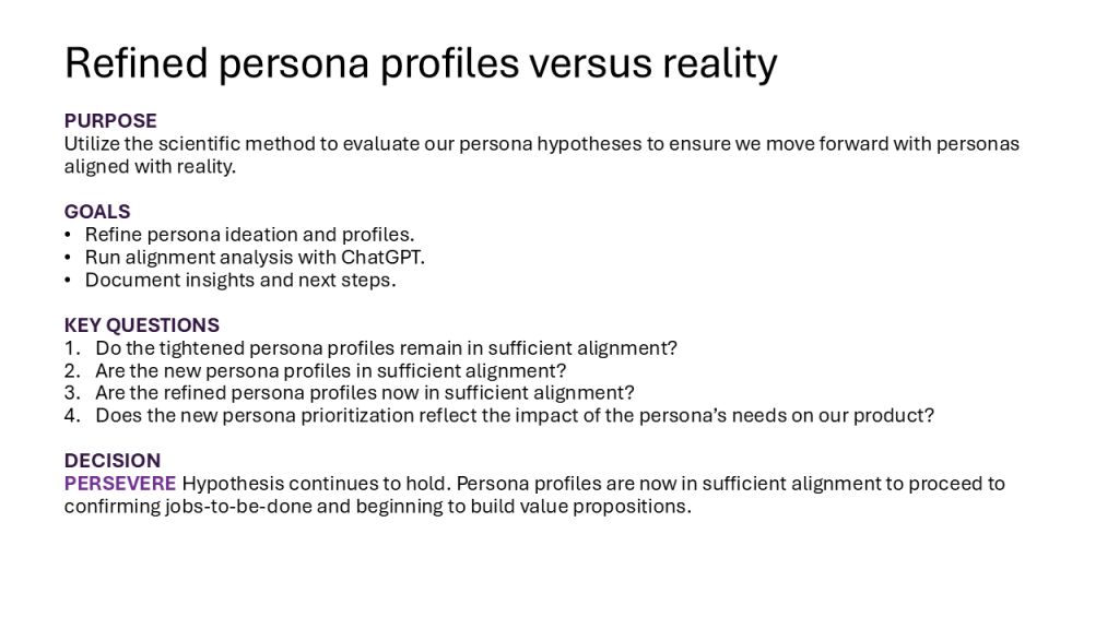 PERSEVERE Hypothesis continues to hold. Persona profiles are now in sufficient alignment to proceed to confirming jobs-to-be-done and beginning to build value propositions.