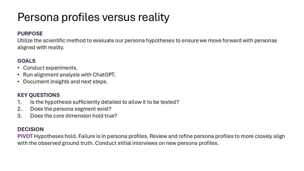 Utilize the scientific method to evaluate our persona hypotheses to ensure we move forward with personas aligned with reality.