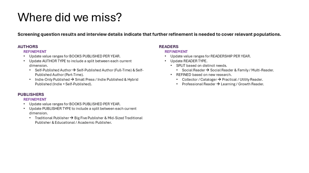 PIVOT Hypotheses hold. Failure is in persona profiles. Review and refine persona profiles to more closely align with the observed ground truth. Conduct initial interviews on new persona profiles.